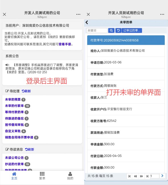 二、手机端界面:与有些公司的大幅压缩手机端功能做法不一样,虽然手机端屏幕小,体验不如PC端,但我们尽可能的多覆盖PC端的功能(90%以上的功能),可在浏览器中输入官网地址登录(http://52bg.cc/tinyfly),我们更推荐微信关注“我爱办公信息技术”公众号,将公众号置顶,直接在公众号中登录即可,非常便捷,不用下载APP,随用随走。