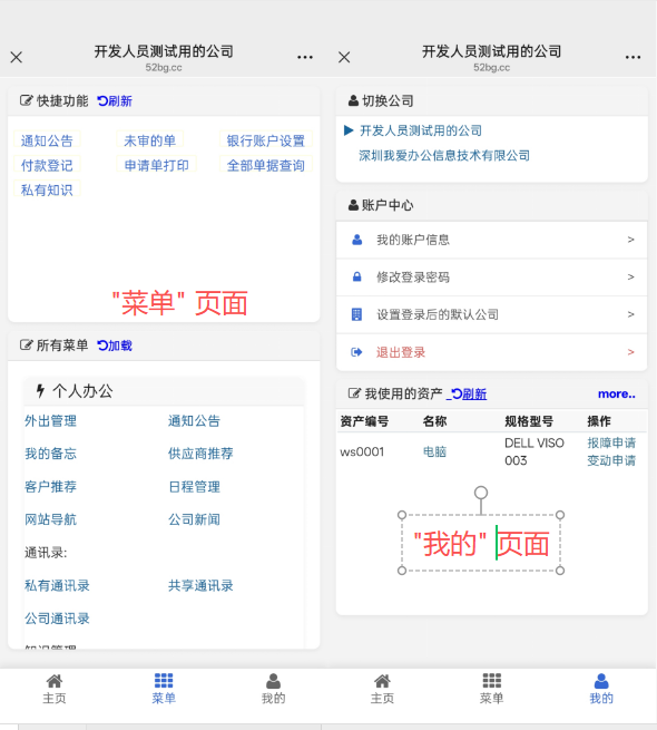 三、对于集团型企业:我们也做了充分的考虑,在系统设计之初就为集团型企业为方向进行设计,一个账户可以关联多个企业,可以在公司列表中方便切换进入不同的公司,不同公司的待办和待阅消息可在任意一个公司内提示,点击即可切换进入对应公司,这种做法即做到了数据的相对隔离,又方便了员工的事务操作,像集团母公司的公告、制度等可以设置向子公司开放共享,公司切换效果如下图所示: